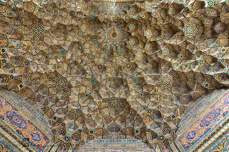 هذه الصور الساحرة للمعمار الإيرانى، الأقواس المدببة، السقف المقبب، الأسطح المغطاة بالبلاط المبهر. إلا أن السحر يبدأ عند شروق الشمس، عندما تتدفق أشعة الشمس عبر الزجاج الملون، محولة الداخل لمشهد مبهر. الصور ليست معدلة أو محسنة رقمياً. هذا ببساطة نتيجة تداخل المعمار وأشعة الشمس.
